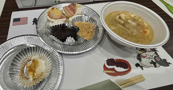 つき上がった餅は、定番の「あんこ」、「きな粉」、「おろし醤油」のほか、斬新な「ピザ風餅」や「ベーコンをトッピングした餅」などが振舞われ、参加者の皆さん「餅の味変」を楽しんでいました。さらに、参加者が和やかに餅の味を堪能している際に、ステージ上では、日米隊員等による琴演奏と太平洋空軍音楽隊の素晴らしい演奏が行われ、餅つきに花を添えるとともに、クリスマス気分と新年を迎える気分を盛り上げていました。