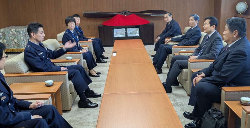 幹部学校に到着後、会長以下5名の役員は、船倉学校長への表敬を行いました。懇談には金野副校長、松川教育部長、菅原課程主任が陪席されました。学校長からは、学校内の組織改編に向けて関係規則の改正に多忙な状況にある旨の説明がありました。また、つばさ会の入会者が減っていることに関して、各基地でOB会の活動や重要性についての説明が不足しているのではないかとの問題認識が示されました。これに関連して、定年退官者の見送りについても辞退者が多くなっている現状を紹介され、人と人とのつながりを強化することも教育に敷衍していきたい旨の発言がありました。