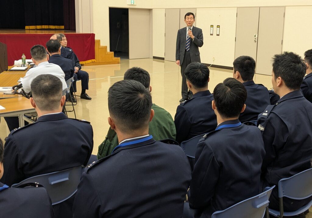 2つの発表を聴講した後に時間を頂き、飯田会長が聴講の機会を頂いたことへの感謝と、「内容が濃く、聞いていて面白かった。自分が学生であった頃の発表からは隔世の感がある。」とのコメント、「今後の空自は皆さんの双肩にかかっています。」とのエールを送りました。